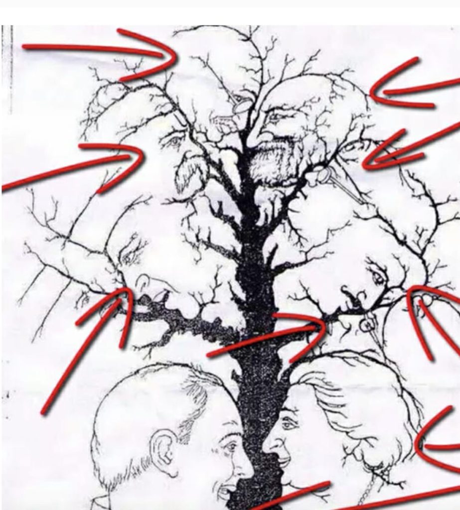 At first glance, most people can easily notice the two faces at the bottom of the tree. But the real challenge begins when you look more closely and try to find the rest hidden among the branches.