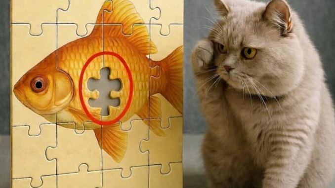 At first glance, this might seem like a simple and even playful puzzle — a curious cat sitting beside a partially completed fish image, waiting for the final piece to fall into place. But don’t be fooled. What looks easy at first often hides a deeper challenge.