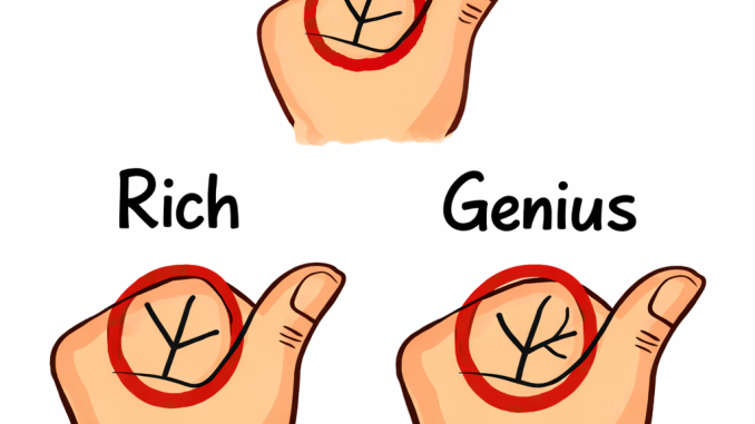 This image shows three different variations of a “Y”-shaped line near the thumb — each one labeled as Poor, Rich, and Genius. At first glance, it may seem simple… but many people believe that the patterns in our palms can reflect our mindset, personality, and even the way we approach life.
