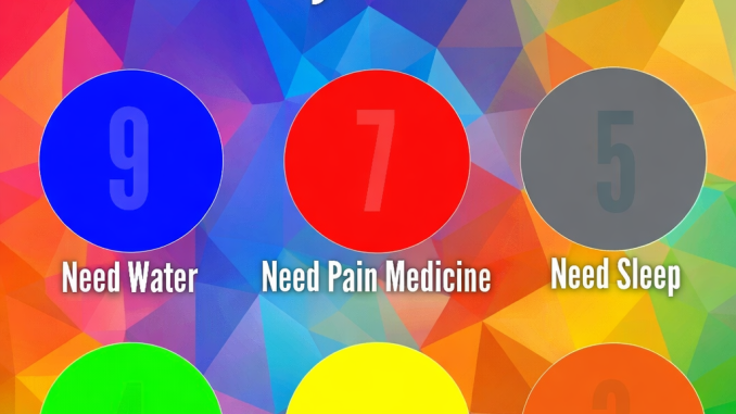 For example, the blue circle contains the number 9, associated with “Need Water.” This suggests that if your brain struggles to detect contrast in that shade, you might be dehydrated—or at least that’s the playful idea behind it. The red circle with the number 7 points to “Need Pain Medicine,” while the gray one with 5 suggests “Need Sleep.” Lower down, the green circle (4) says “Need Food,” the yellow circle hints at “Need Fabric” (often interpreted as comfort or warmth), and the orange circle (3) points to “Need Glasses,” implying possible vision strain.