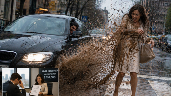 I was waiting at a crosswalk when a black BMW sped past, soaking me in dirty water. It hit my dress, my bag, even my face.