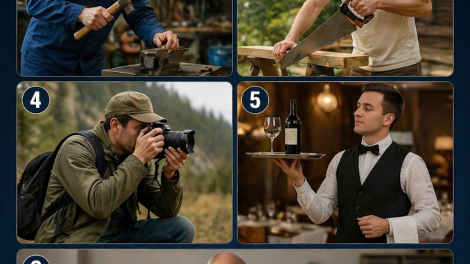 Each person is using their hands to perform a specific action: hammering, sawing, writing, taking a photo, or carrying a tray. The challenge is to figure out which one of them is left-handed.