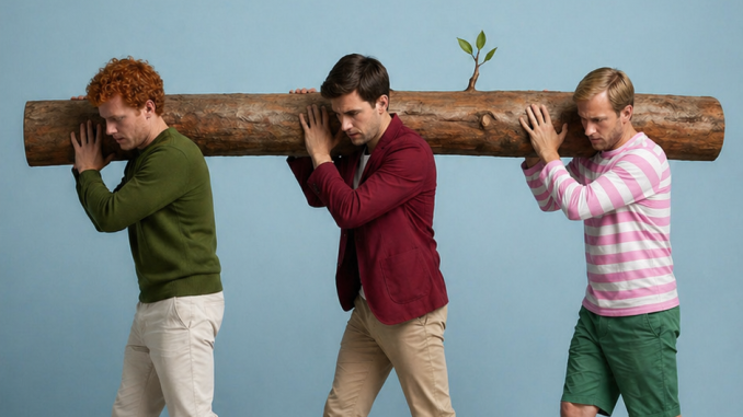 At first glance, the image seems simple. Three men are walking together, carrying a long wooden log on their shoulders. Each one appears to be sharing the load equally. It looks like teamwork at its finest — balanced, fair, and straightforward.