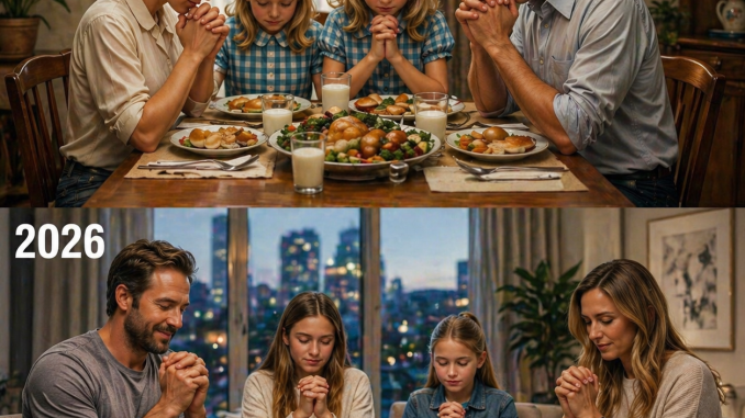 In the top half, set in 1980, a family sits closely together around the dinner table. Their heads are bowed, hands joined, sharing a quiet moment before the meal. There is no distraction, no rush—just presence. The table is filled with simple food, and yet the real focus is not the meal itself, but the connection between them. Everyone is there, mentally and emotionally. This scene reflects a time when dinner was more than just eating—it was a ritual, a pause in the day where families reconnected, talked, and shared moments that built lasting bonds.