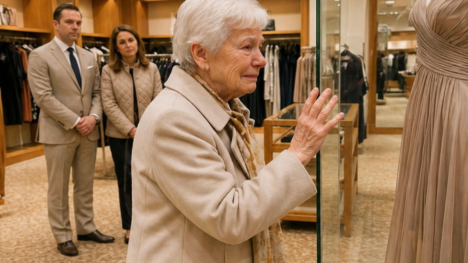 But he didn’t leave. Soon, another staff member appeared. Then security. Three people watching an elderly woman quietly standing in front of a dress.